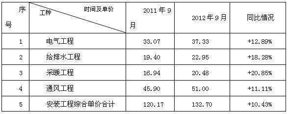 根据协会统计数据,2012年9月安装工程综合面积单价比2011年9月提高了10.43%。其中,电气工程2012年9月的综合面积单价与去年同期相比,提高了12.89%,给排水工程提高了18.28%,采暖工程提高了20.85%,通风工程提高了11.11%。