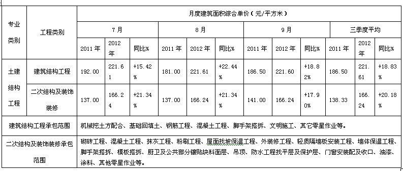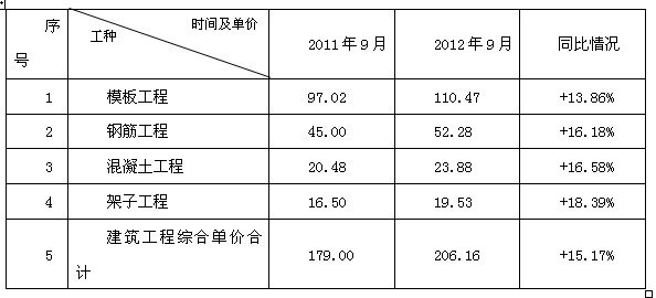 根据人力资源协会统计数据,2012年9月建筑工程综合面积单价比2011年9月提高了15.17%。其中,模板工程2012年9月的综合面积单价与去年同期相比提高了13.86%,钢筋工程提高了16.18%,混凝土工程提高了16.58%,架子工程提高了18.38%。