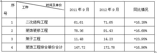 根据协会统计数据,2012年9月装饰工程综合面积单价比2011年9月提高了16.96%。其中,二次结构工程2012年9月的综合面积单价与去年同期相比提高了16.28%,装饰装修工程提高了16.68%,架子工程提高了23.95%。